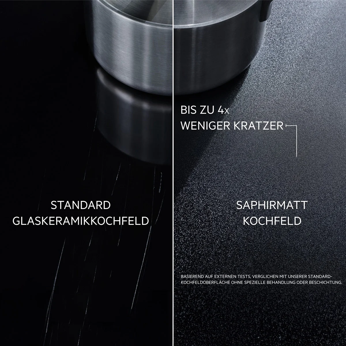 Im Alltag lassen sich durch das Verrücken von Pfannen und Töpfen Kratzer auf einem herkömmlichen Kochfeld kaum vermeiden. Das neue AEG SaphirMatt Kochfeld bietet Dank der exklusiven SaphirMatt Glaskeramikoberfläche bis zu 4x mehr Schutz im Vergleich zu einer Standard-Oberfläche*.
