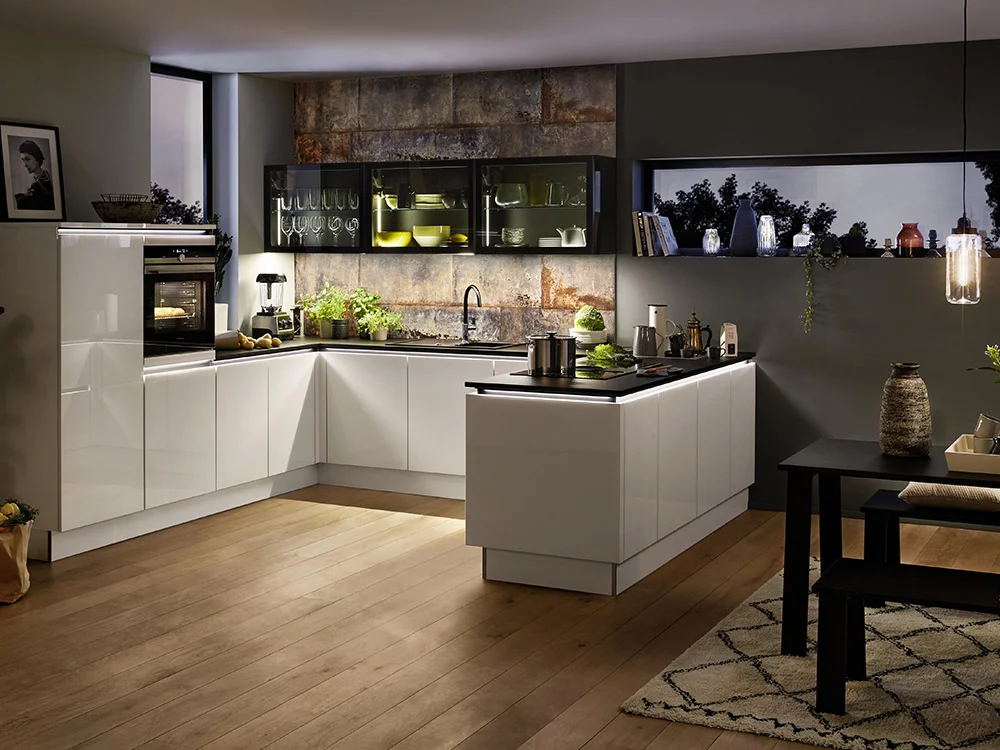 Die Küche ist ein Raum für alle Sinne, insbesondere auch für unsere Augen. Denn wir wissen: Das Auge isst nicht nur mit, sondern es kocht auch mit. Deshalb ist die Beleuchtung ein wichtiger Teil der Küchenstaltung. Mit einem direkten Licht im Arbeitsbereich kann die Qualtität der Speisen bestens beurteilt werden. Bei gutem Licht sieht das geübte Auge den Gargrad des Gerichtes und hat die Kontrolle über Sauberkeit und Hygiene. Und im Essbereich sorgen Sie mit stimmungsvollen Lichtaktzenten für eine wohltuende Athomsphäre. Unsere Küchenprofis zeigen Ihnen gerne die Vielfalt der modernen Küchenbeleuchtung: Von Unterbodenbeleuchtungen in Halogen- oder LED-Qualtität über beleuchtete Nischenausstattungen und Glasböden mit integrierter Beleuchtung bis hin zu Sockelleuchten: Mit dem richtigen Lichtkonzept macht Ihnen Ihre Küche noch mehr Spaß.