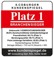Der Coburger Kundenspiegel, der regelmäßig die Zufriedenheit der Kunden in verschiedenen Branchen untersucht, bewertete in diesem Jahr insgesamt neun Einrichtungshäuser. Das Einrichtungshaus Schulze konnte dabei mit herausragenden Ergebnissen glänzen.