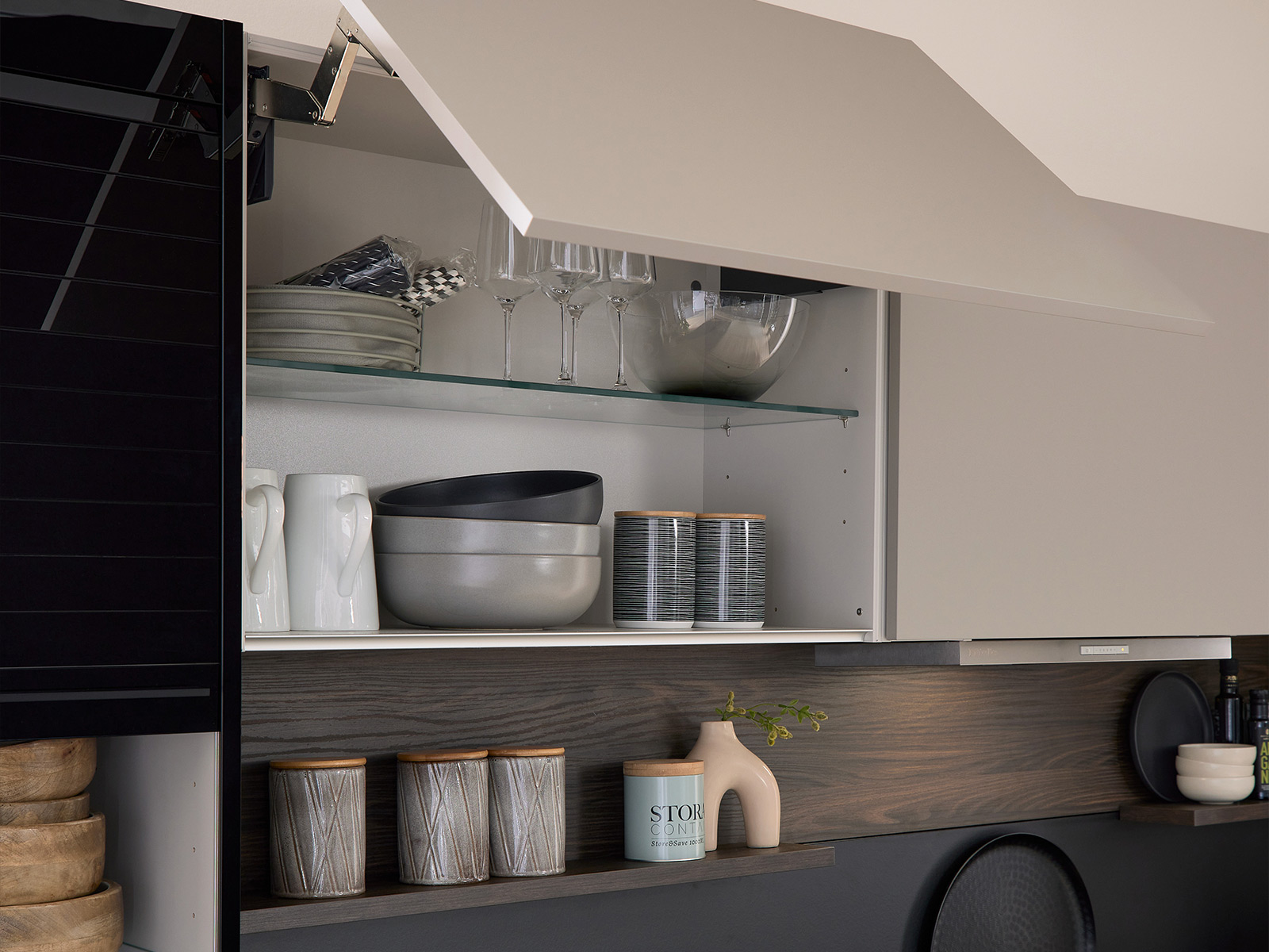 L-Küche mit Jalousie-Aufsatzschrank, Hängern und separatem Hochschrankelement