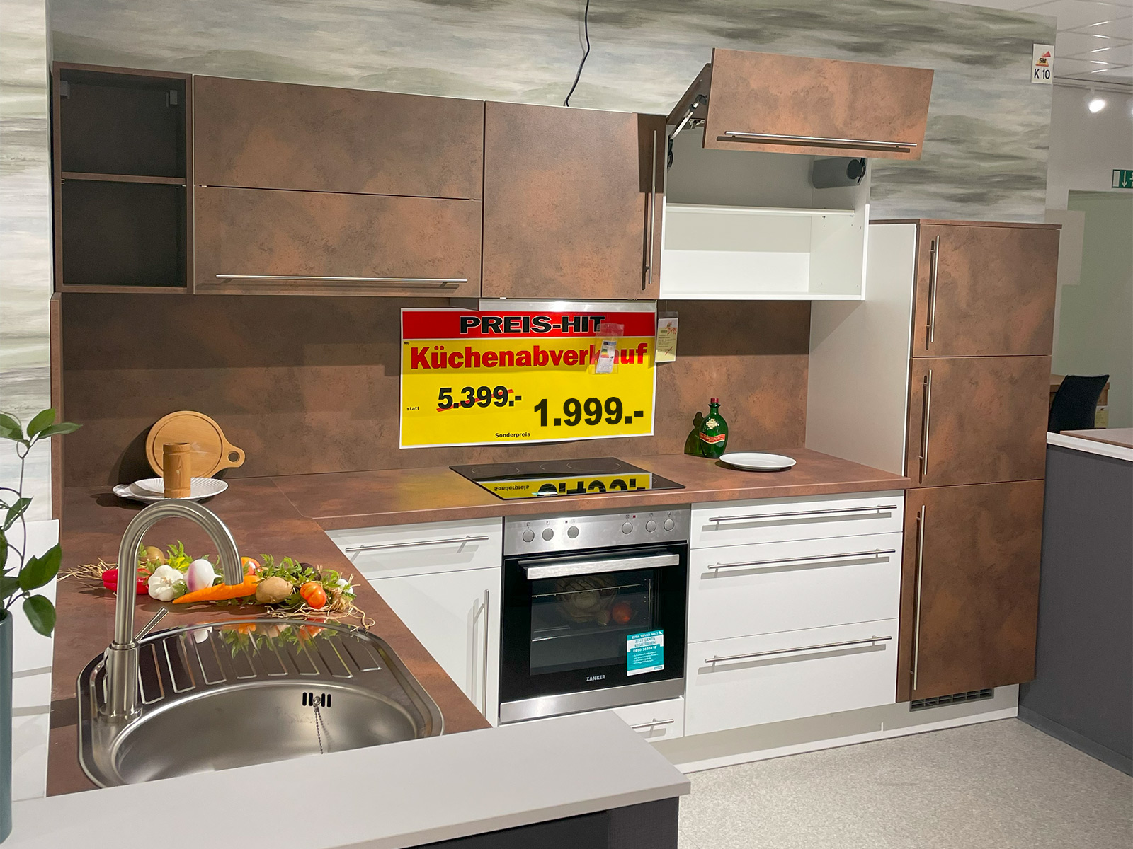 Musterküche | Pino Winkelküche in Weiß-Cortenstahl-Optik