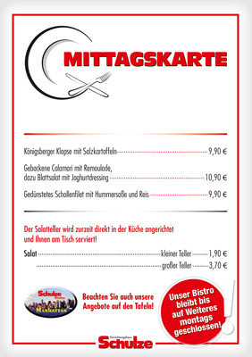 In angenehmer Atmosphäre bieten wir Ihnen im Einrichtungshaus Schulze in Ilmenau leckere Frühstücksangebote, danach eine wechselnde Auswahl regionaler Spezialitäten und internationaler Gerichte. Knackige Salate vom Buffet oder ein Stück Kuchen mit einer Kaffeespezialität runden unser Angebot ab.
